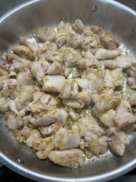 - Kuumenna suuri pannu tai wok keskilämmöllä ja lisää 2 rkl öljyä. Paista noin 6 minuuttia, kunnes pinta on rapea ja liha on lähes kypsää. Siirrä kanat lautaselle.