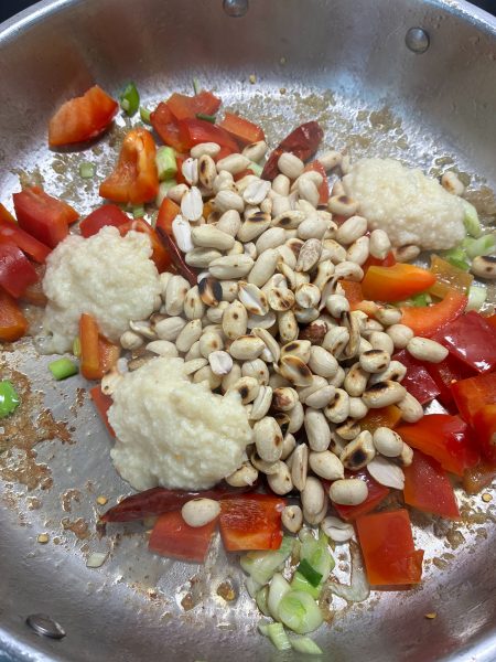 Monissa ohjeissa kehotetaan vain heittämään pähkinät sekaan, mutta olet lisännyt reseptiisi erittäin tärkeän vaiheen: pähkinöiden paahtamisen. Kun raakoja tai jopa valmiiksi paahdettuja maapähkinöitä paahdetaan hetki kuivalla pannulla (tai pienessä tilkassa öljyä), niiden eteeriset öljyt aktivoituvat. Tämä syventää niiden pähkinäistä makua eksponentiaalisesti ja varmistaa, että ne pysyvät rapeina myös kastikkeen lisäämisen jälkeen.